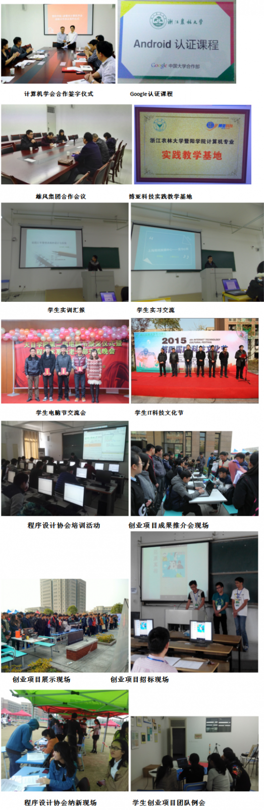 本专业十分注重学生创新、创业实践能力的培养。因此,专业在实验室、实习、实训等实践环节的软、硬件条件建设方面倾注了大量心血。教学上包括常规的电子实验室、网络实验室、图形图像实验室、软件实验室等专业实验室,同时先后与Google中国教育合作部、北京千锋互联、虹软、正方软件、诸暨市计算机学会、雄风集团、诸暨火棘网络科技有限公司、诸暨市博亚科技网络有限公司等多家企业开展校企合作,共同创建学生校外实习基地,为专业实践训练提供了保障。