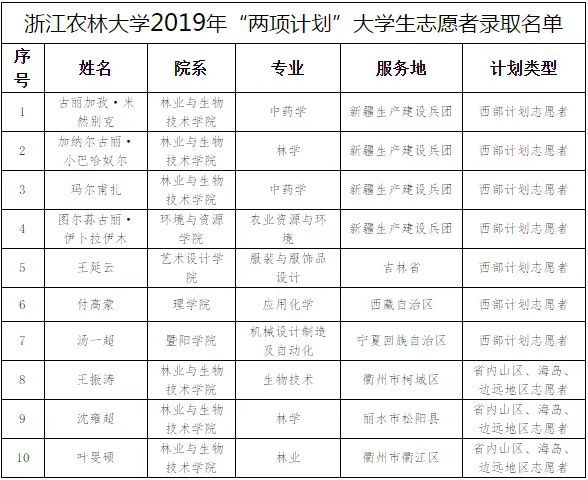据悉,浙江农林大学根据《2019年浙江省大学生志愿服务我国西部和我省山区、海岛、边远地区计划招募方案》的相关要求,于今年5月启动2019年“两项计划”志愿者招募工作。经过严格考察,最终确定10人为浙江农林大学2019年“两项计划”大学生志愿者,他们奔赴祖国各地开展为期1-3年的志愿服务工作。